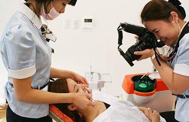 к зубам прикладывается палитра центов, делается снимок